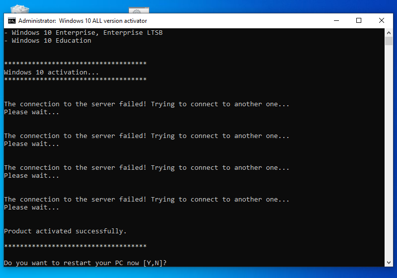 Finally, let the script run. While it's running, it may say "The connection to the server failed!" a few times. This is normal, as it will do this a few times while it finds an activation server. Once it says "Product activated successfully." you may push Y to restart the computer.